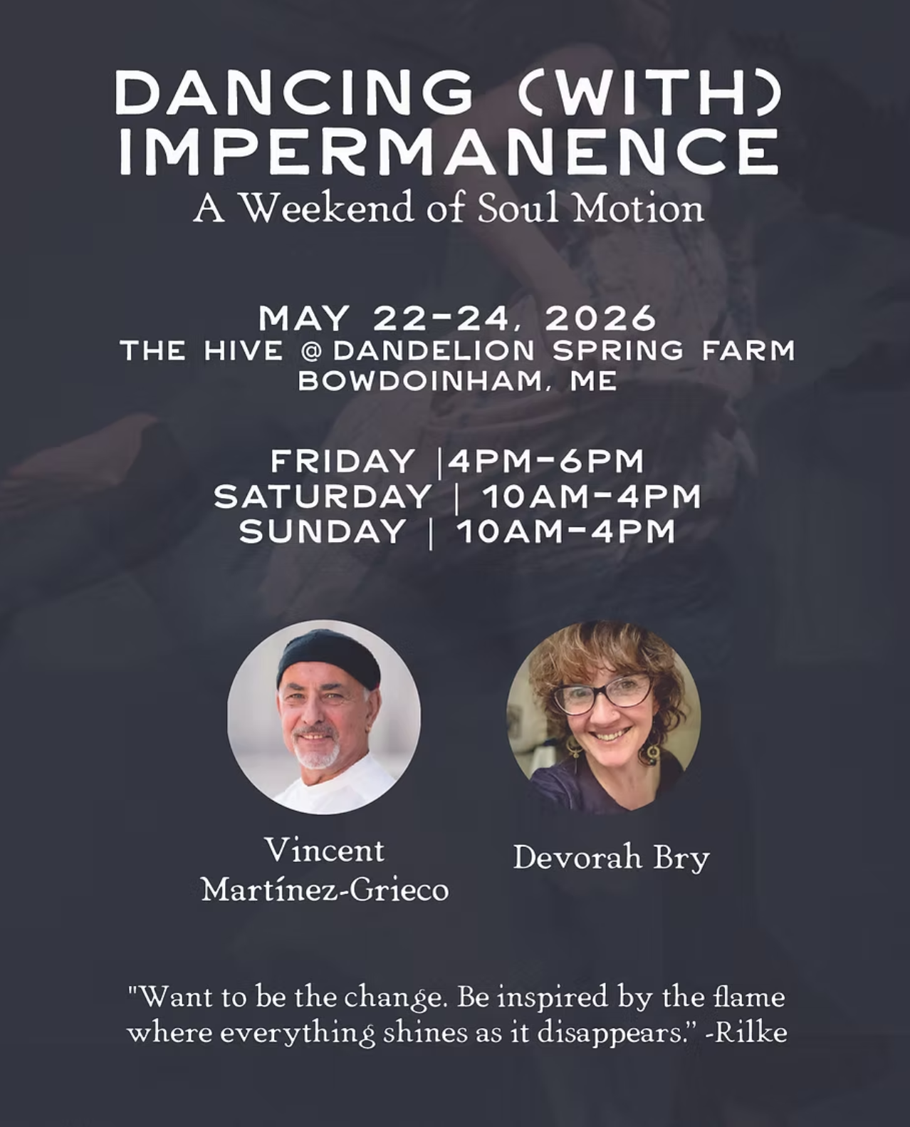 Join Vincent, Dev and other dancing souls for a Soul Motion weekend in Maine. With mindfulness, motion, and irreverent reverence